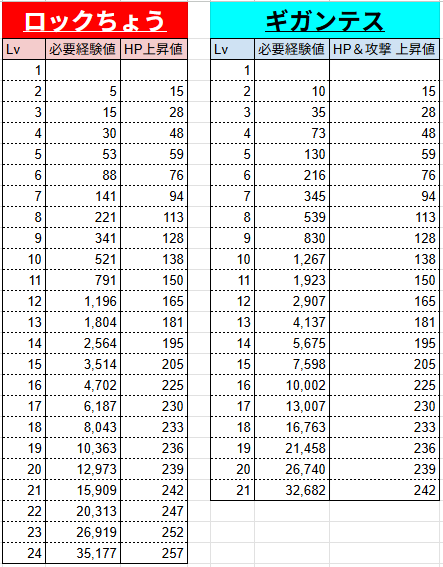 また、ロックちょうLv21は通常(=ロックちょうLv17)と比べてHP 12ポイント高いです。